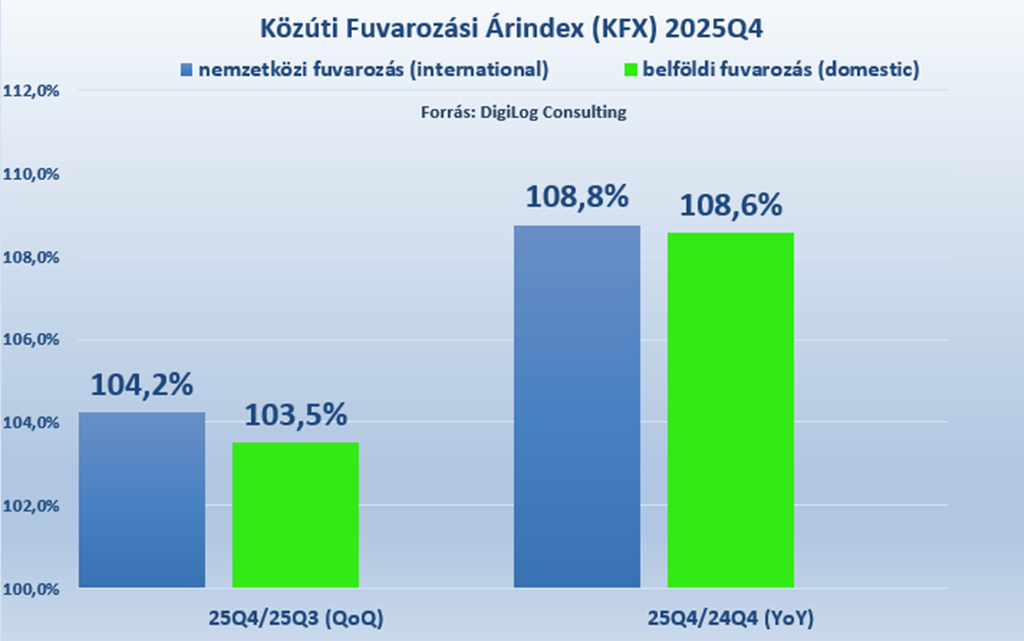 A nemzetközi fuvarozásban 8,8%-os, a belföldi fuvarozásban pedig 8,6%-os összköltség-növekedést mért a DigiLog Consulting 2025 IV. negyedévében az előző év azonos időszakához képest. A legtöbb költségtétel szignifikáns növekedést mutatott: a gépjárművezetői bérek 6,2-7,7%-kal, az autópályadíjak 3,7-7,6%-kal, a járművek finanszírozási költsége 30,4-35,5%-kal, a lízingkamatok pedig 36,6-39,4%-kal nőttek, míg ezek ellensúlyozására az „egyéb” költségeket csupán 0,7-1,8%-kal tudták mérsékelni a fuvarozók.